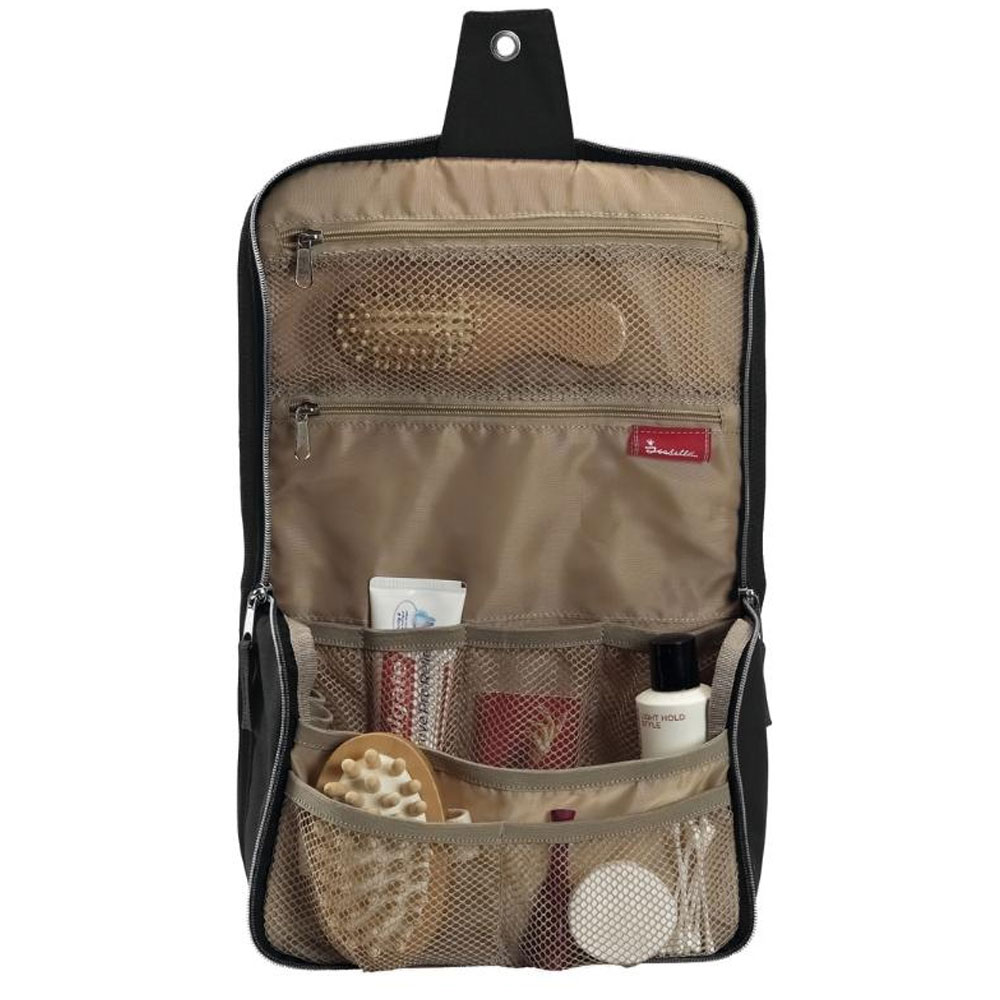 Let og praktisk toilettaske med ophængskrog og spejl.