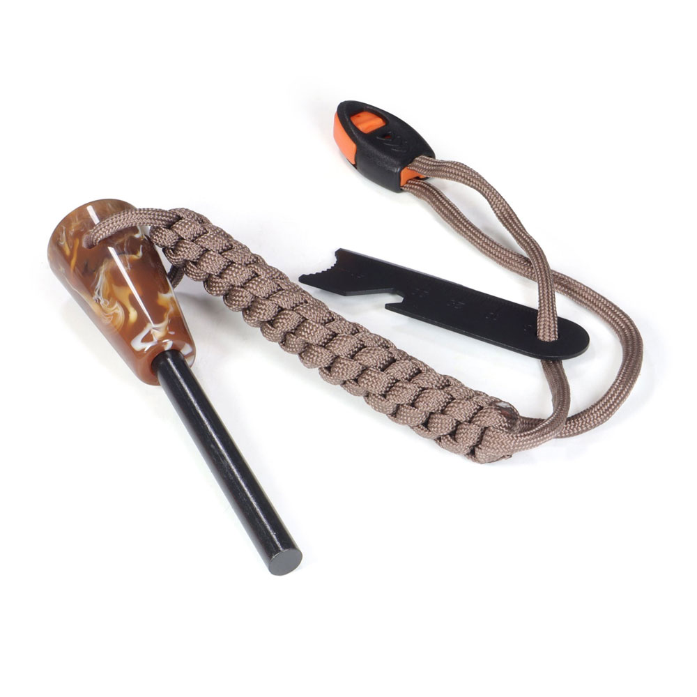 Firesteel Stone har et slidstærkt håndtag i elegant steninspireret design, som giver et sikkert greb – også med handsker eller våde hænder. Den kraftige magnesiumstang skaber gnister på op til 3.000°C, hvilket gør det nemt at tænde bål, grill eller brænder på turen. På den ca. 2 meter lange paracord medfølger en nødfløjte, så du kan tiltrække opmærksomhed i kritiske situationer. Skraberen fungerer samtidig som flaskeåbner, lineal, kortmåler (1:100000) og 8 mm skruenøgle – et kompakt multiværktøj lige ved hånden.
